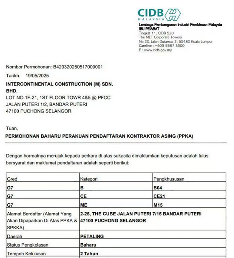 近日,經馬來西亞建筑工業(yè)發(fā)展局(CIDB)批準,合景建設集團有限公司全資子公司洲際建設(馬來西亞)有限公司取得馬來西亞最高等級G7承包商資質,包括土木工程(CE21)、土建工程(B04)、機電工程(M15)以及各種機械工程等多項內容。這是合景建設在馬來西亞建筑資質領域的重大突破,意味著公司在智慧建筑領域的技術實力、屬地化服務能力及行業(yè)影響力獲官方權威認可。