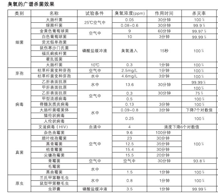 臭氧具有極強(qiáng)的氧化性的特點,被世界公認(rèn)是一種廣譜高效殺菌劑,它的氧化能力高于氯一倍,滅菌比氯快600-3000倍,甚至幾秒鐘內(nèi)可以殺死細(xì)菌,對于常見的大腸桿菌、糞鏈球菌、綠膿桿菌、金黃葡萄球菌、霉菌等,在臭氧的環(huán)境中5分鐘,其殺滅率可達(dá)到99%以上。