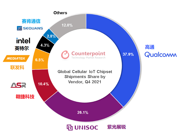 幾乎所有物聯(lián)網(wǎng)終端都需搭載IoT通信芯片,因而通信射頻芯片能夠直觀反映物聯(lián)網(wǎng)行業(yè)的成長周期與終端需求,堪稱行業(yè)風(fēng)向標(biāo)。在Counterpoint發(fā)布的全球蜂窩物聯(lián)網(wǎng)芯片追蹤報告中,高通、紫光展銳、翱捷科技、聯(lián)發(fā)科、英特爾、Sequans、華為海思等占據(jù)了大部分市場份額。