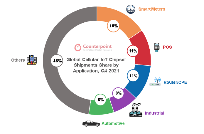 在蜂窩物聯(lián)網(wǎng)芯片中,當(dāng)前應(yīng)用規(guī)模最大的是低速率的NB-IoT芯片(占比60%),NB-IoT也是我國主推的物聯(lián)網(wǎng)連接方式,應(yīng)用在智能儀器表盤、資產(chǎn)追蹤等場景。其次是中速率的2G/3G(占比30%),用于移動支付、智能穿戴和智能家居中。4G Cat.1和5G大約占比10%, 5G模組的成本過高,加上大部分物聯(lián)網(wǎng)終端對傳輸速率的需求性不高,5G在物聯(lián)網(wǎng)終端的應(yīng)用占比較低,主要是自動駕駛和視頻監(jiān)控領(lǐng)域,但隨著2G/3G轉(zhuǎn)網(wǎng),Cat.1在智能支付、定位追蹤、車載終端、視頻監(jiān)控領(lǐng)域的高速增長,正逐漸打破蜂窩物聯(lián)網(wǎng)6:3:1的格局。從應(yīng)用場景來看,智能表計、POS支付、路由器/CPE、工業(yè)、汽車是蜂窩物聯(lián)網(wǎng)芯片應(yīng)用最廣泛的前五大場景。