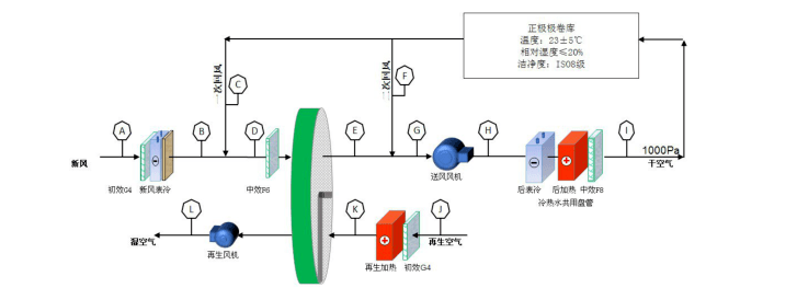 2)低濕需求空調(diào)房間,如正極輥壓間、正極分條間、正極模切間以及正極二分間等房間,其濕度控制需求為≤20%,以及正極涂布間、負極輥壓間、負極分條間、負極模切間以及負極二分間等房間,其濕度控制需求為≤45%,該需求通過冷卻除濕很難實現(xiàn),因此往往通過轉(zhuǎn)輪除濕機組處理后來滿足使用需求,機組中設置一級轉(zhuǎn)輪。